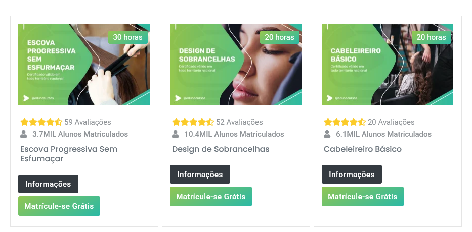 Já a EduNe Cursos disponibiliza formações 100% gratuitas e online, com carga horária que varia entre 10 e 80 horas. Entre os cursos mais procurados estão o curso de cabeleireiro básico, maquiagem profissional, design de sobrancelhas e visagismo.