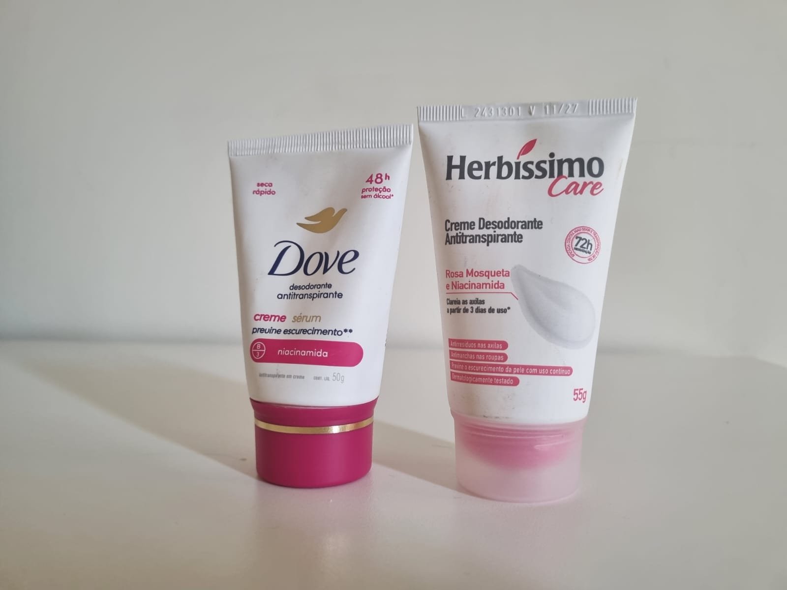 O bom é que essa reclamação não é só minha, que agora temos desodorante em creme com niacinamida e muitos outros produtos clareadores, de várias marcas, mas optei por comprar o desodorante da Dove e o da Herbíssimo para usar.