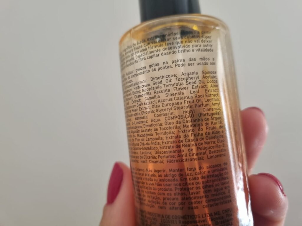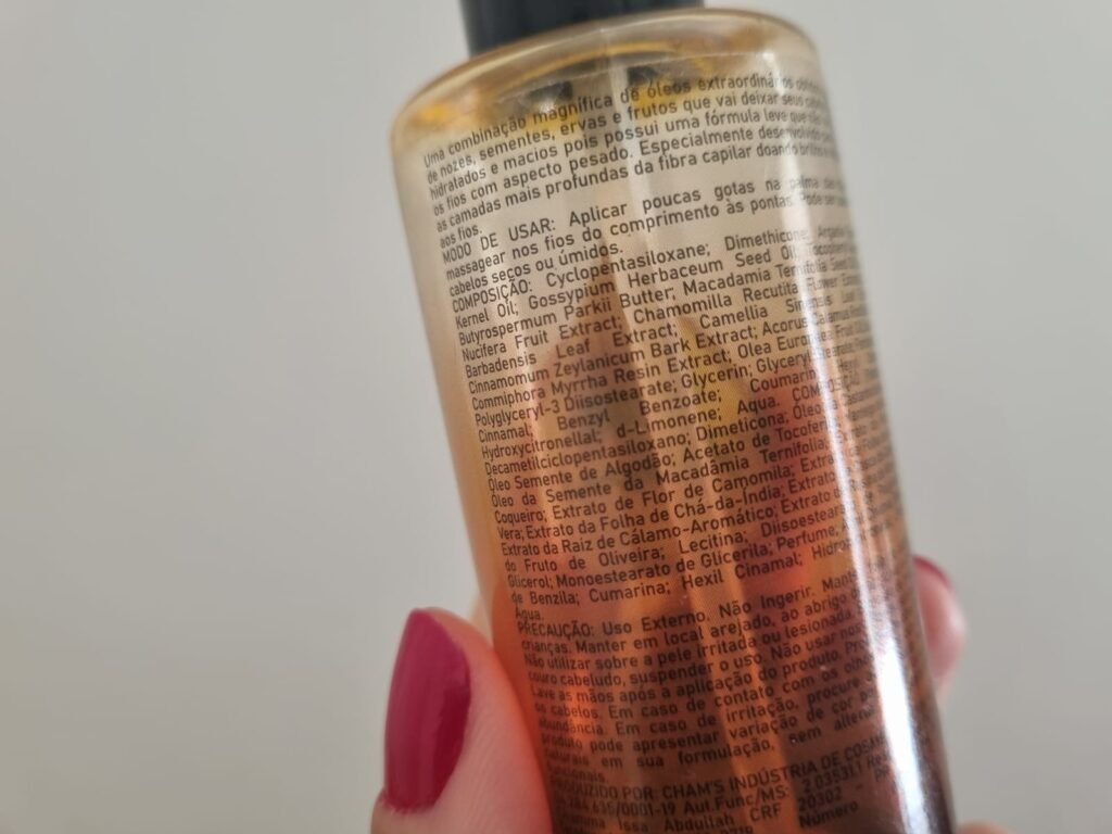 Ou seja, é um óleo finalizador de efeito cosmético (mais aparência do que tratamento profundo) porém carrega a mesma lógica de vários óleos famosos que é misturar silicones (pra dar efeito imediato de cabelo alinhado e brilhante) com óleos vegetais nutritivos (pra dar um cuidado extra).