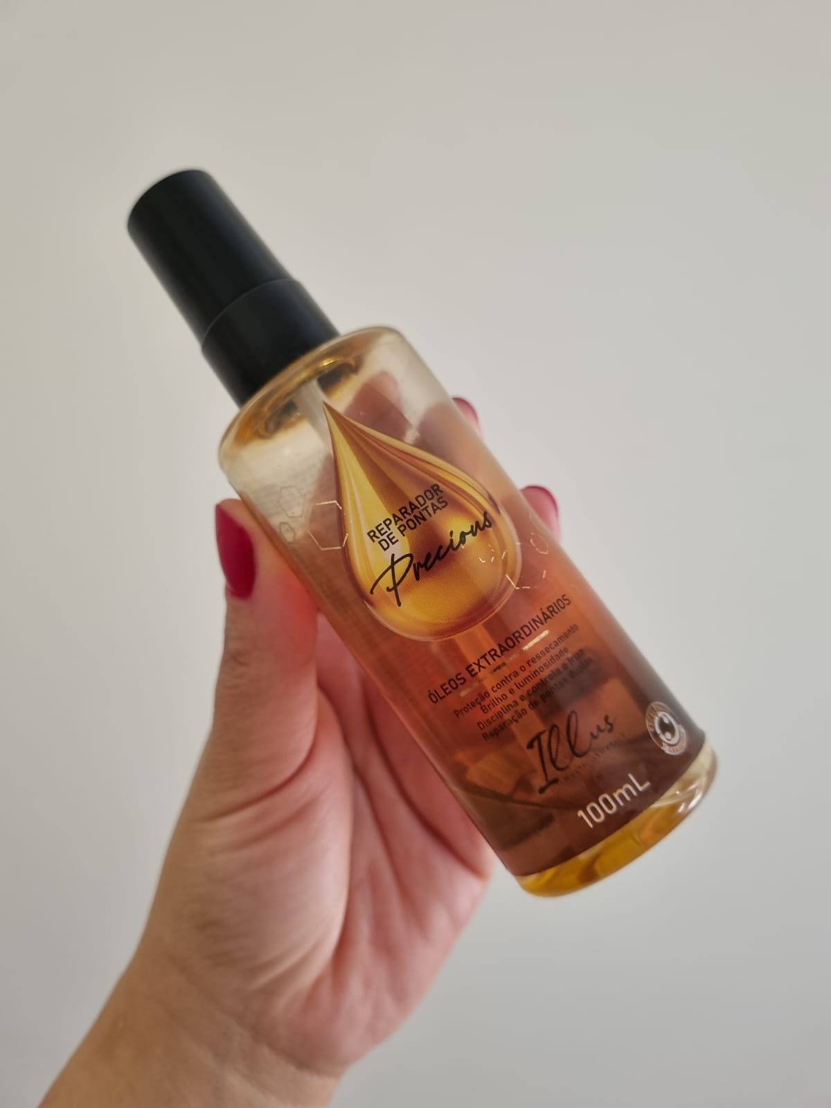 Nessa de sempre procurar um custo-benefício (as palavra mágica das minhas resenhas), comprei um óleo reparador de cabelo por R$20 às cegas e acabei apaixonada por ele. O Illus óleo reparador de pontas precious é bem parecido com aquele famoso óleo extraordinário que conhecemos.